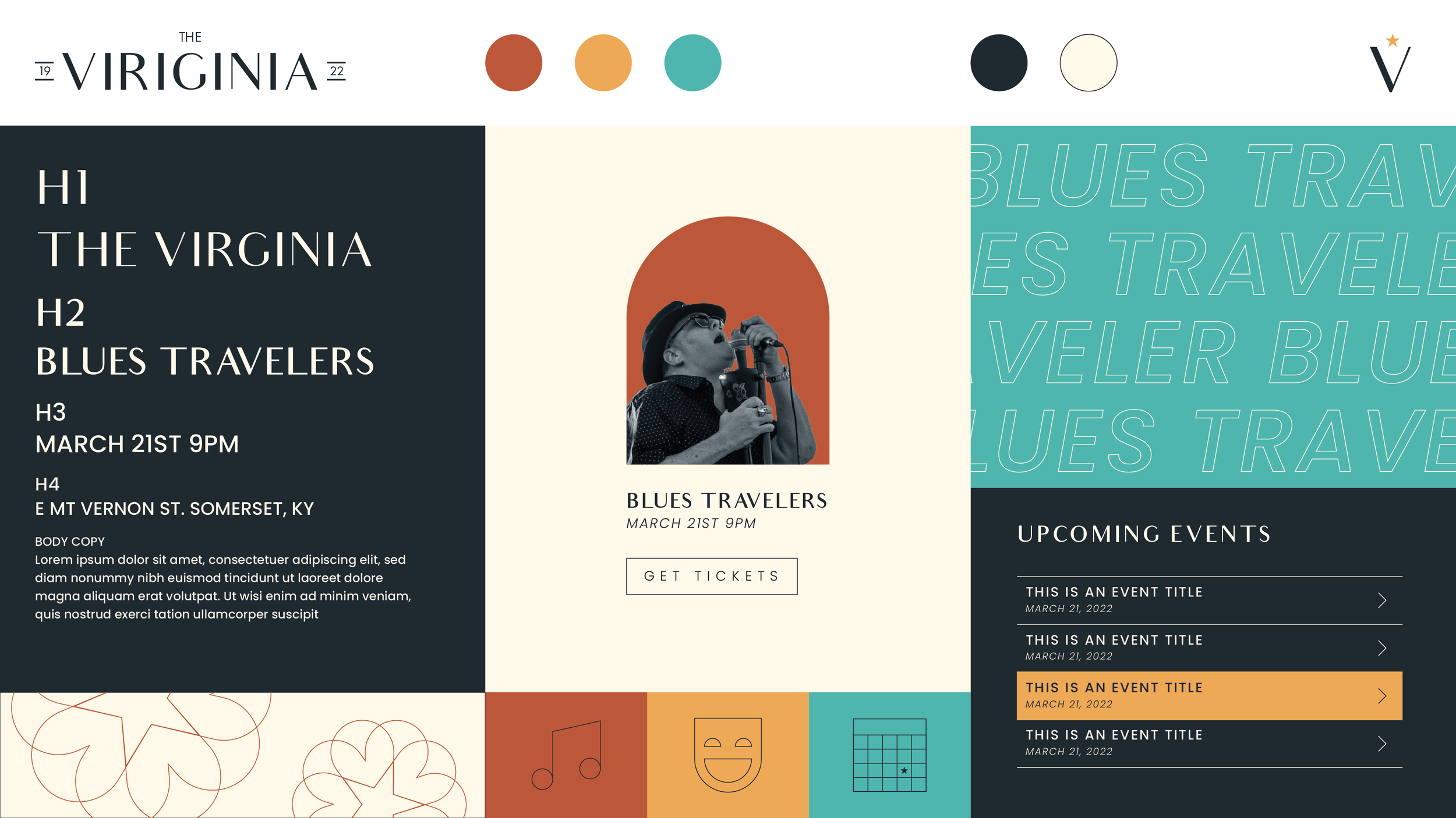 We were honored to develop a new brand identity and website for the historic Virginia Theatre in Somerset, Kentucky. As part of a $2 million revitalization effort, this 100-year-old landmark was transformed into a vibrant live performance venue and community event space. Our work aimed to capture the theater's rich history while crafting a fresh, modern look that reflects its exciting new purpose. The result is a visual and digital presence as timeless as the Virginia itself, designed to resonate with residents and visitors alike.